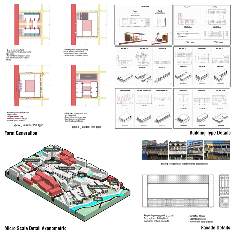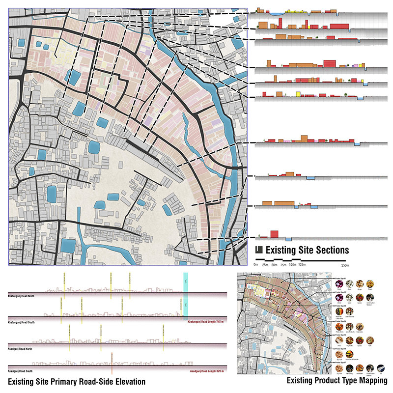 This project adopts a multilayered urban redevelopment framework to address these challenges and revive Khatunganj as a resilient, efficient, and historically enriched wholesale market. The research methodology combines extensive secondary research with primary data collection through field surveys, stakeholder interviews, and mapping exercises. Observations from on-site investigations identified critical connection points, including congested roads, unorganized plot divisions, and the diminishing utility of the Chaktai Canal as a trade route.