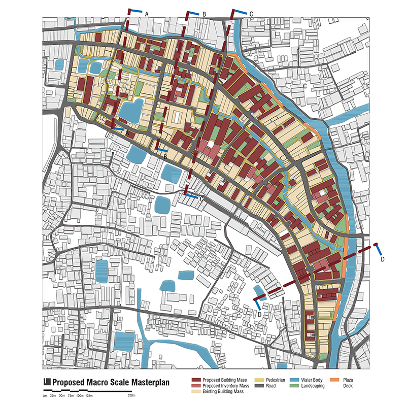 Micro-level strategies delve into detailed shop layouts with fire safety measures, façade preservation to maintain architectural heritage, and the creation of vibrant canal-front activity zones to reconnect the community with the waterfront.