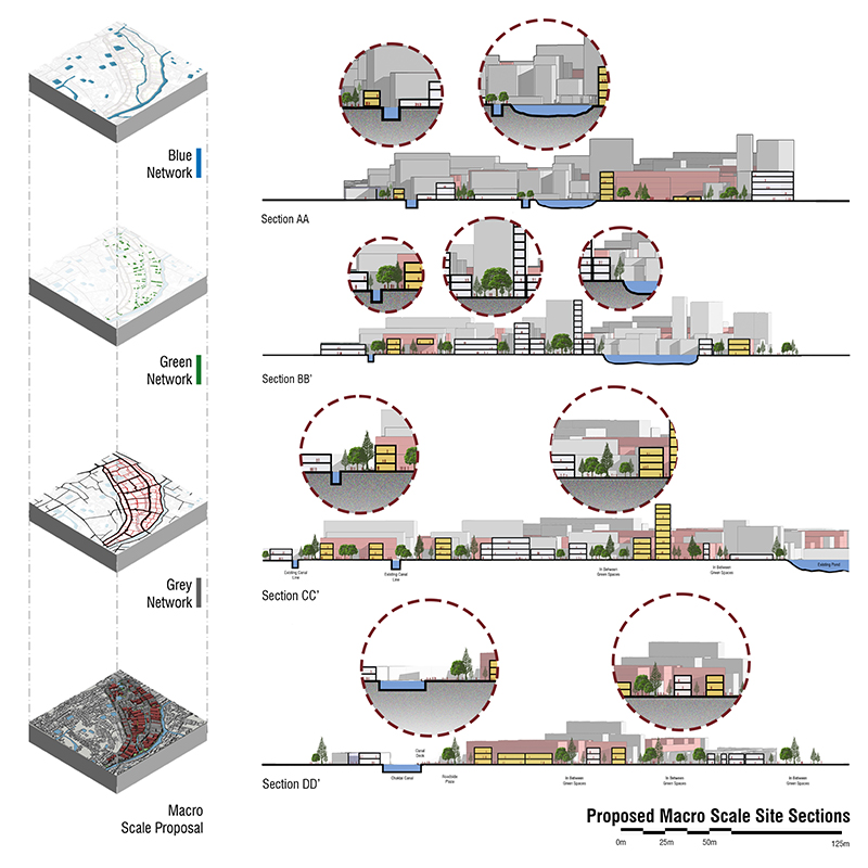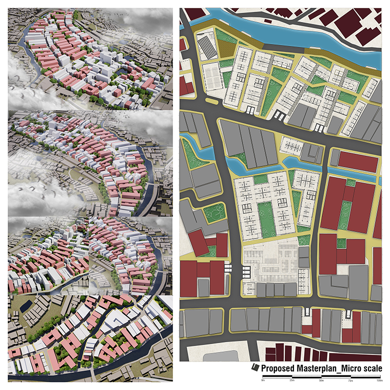 Design interventions were conceptualized across three scales—macro, meso, and micro—focusing on urban infrastructure, spatial reorganization, and heritage conservation. Macro-level solutions involve redesigning road networks to enhance vehicular and pedestrian flow, reactivating the canal through pollution control and waterway management, and introducing interconnected pedestrian pathways.